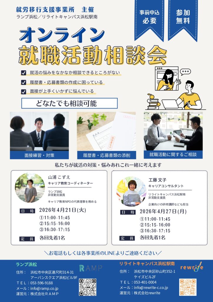就労移行支援事業所ランプ浜松と、リライトキャンパス浜松駅南の合同企画として、4月に「就職活動相談会」を開催いたします 。本相談会はオンラインでの開催となります 。
